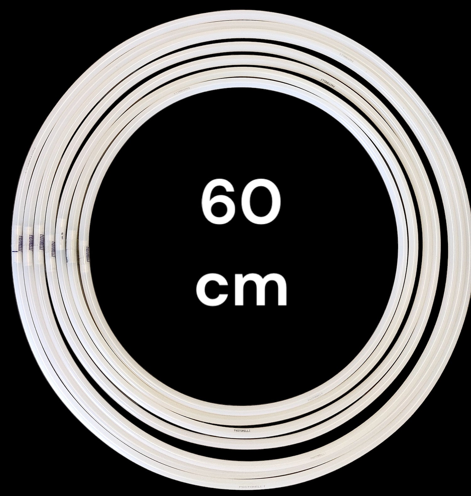 Tøndebåndet er 60 cm. i diameter (indvendigt mål) og den runde plastprofil er 14-15 mm i diameter.