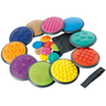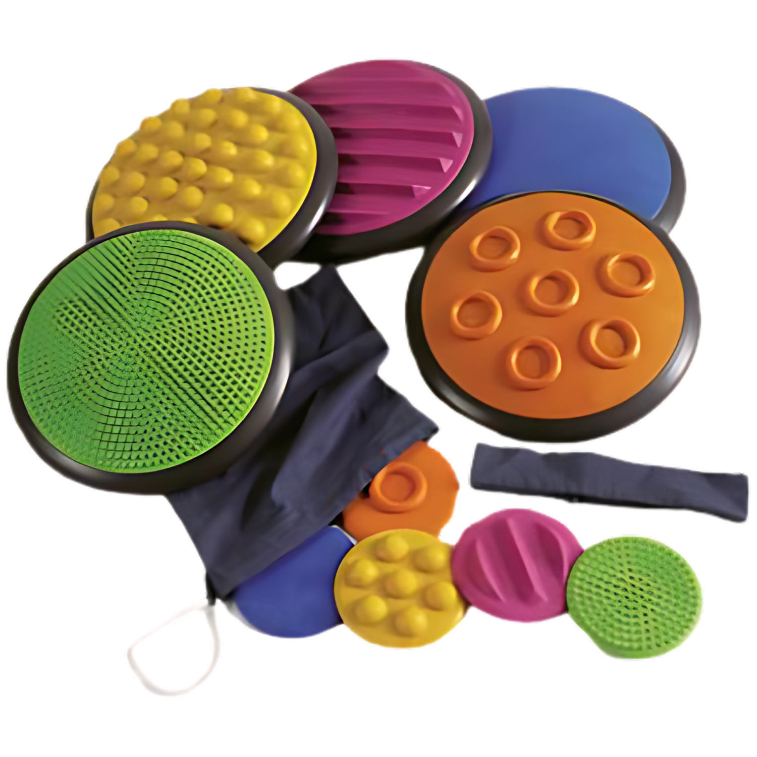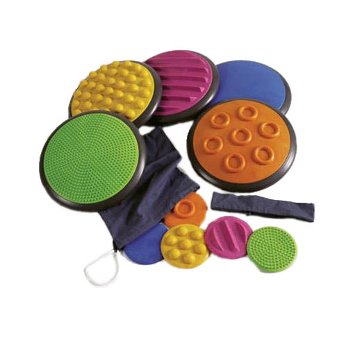 Disse føleskiver inviterer børnene til at bruge og udvikle deres følesans. Sættet består af 5 store og 5 små føleskiver, hver skive med eget mønster og farve.