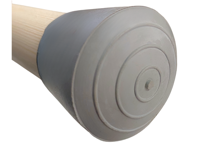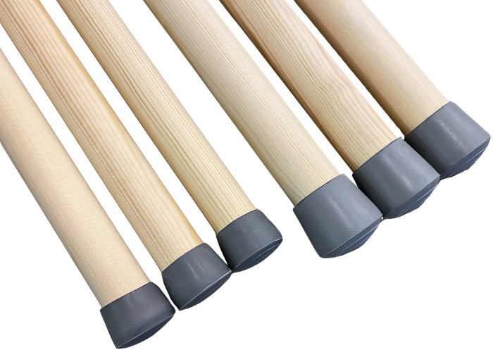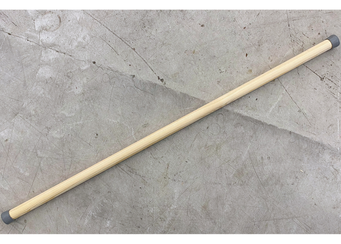 Gymnastikstav fremstillet af massiv fyrretræ med en glat, poleret finish, og afsluttet med slidstærke grå dupsko i naturgummi i enderne, som sikrer godt greb og beskytter gulvet.