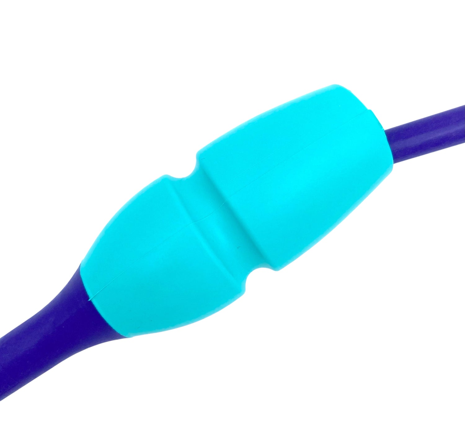 Tofarvet gymnastikkølle fra Pastorelli med en krop (den turkis del) af gummi, hvilket gør, at køllen kan stødes mod gulvet og springe tilbage.