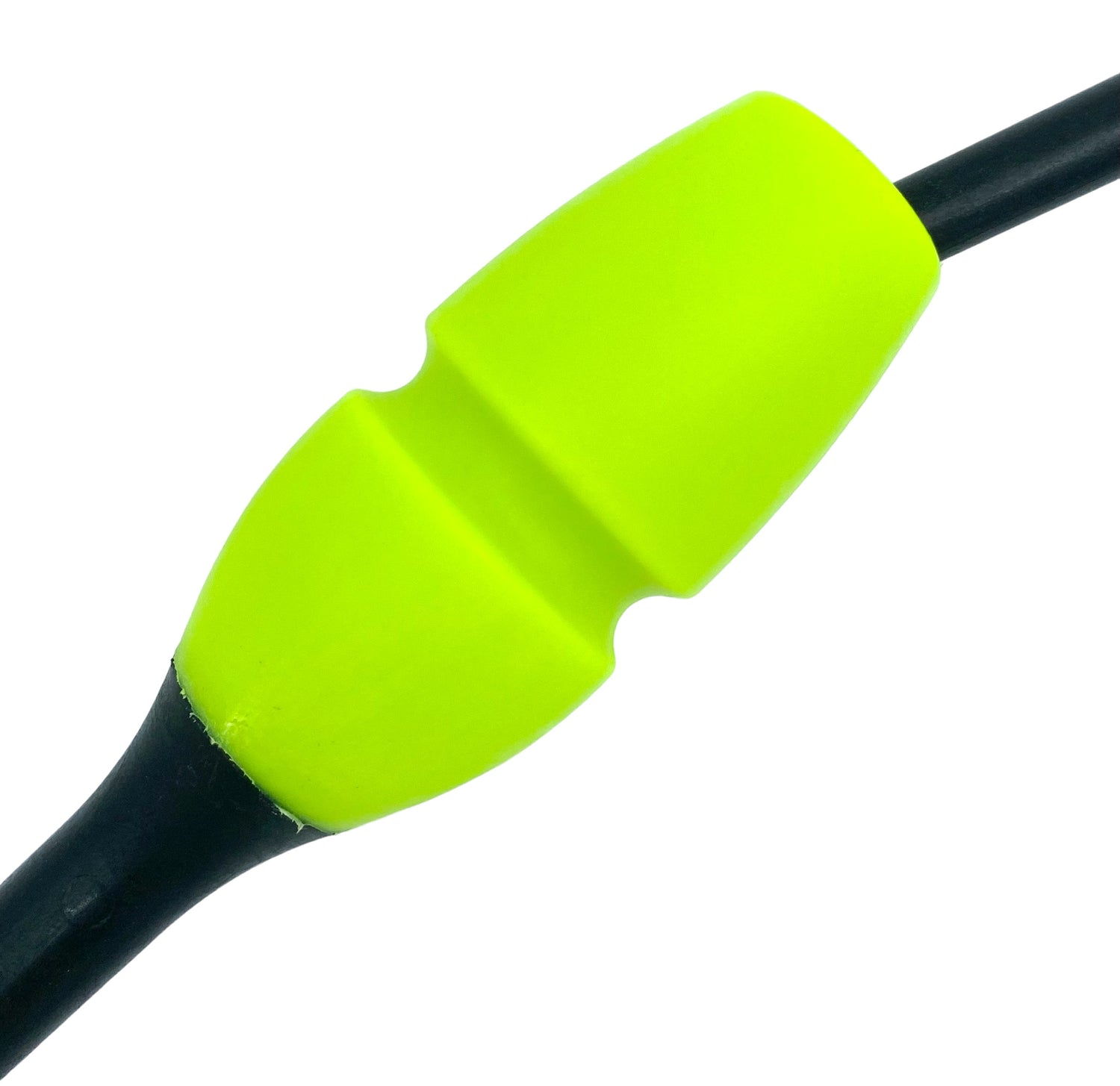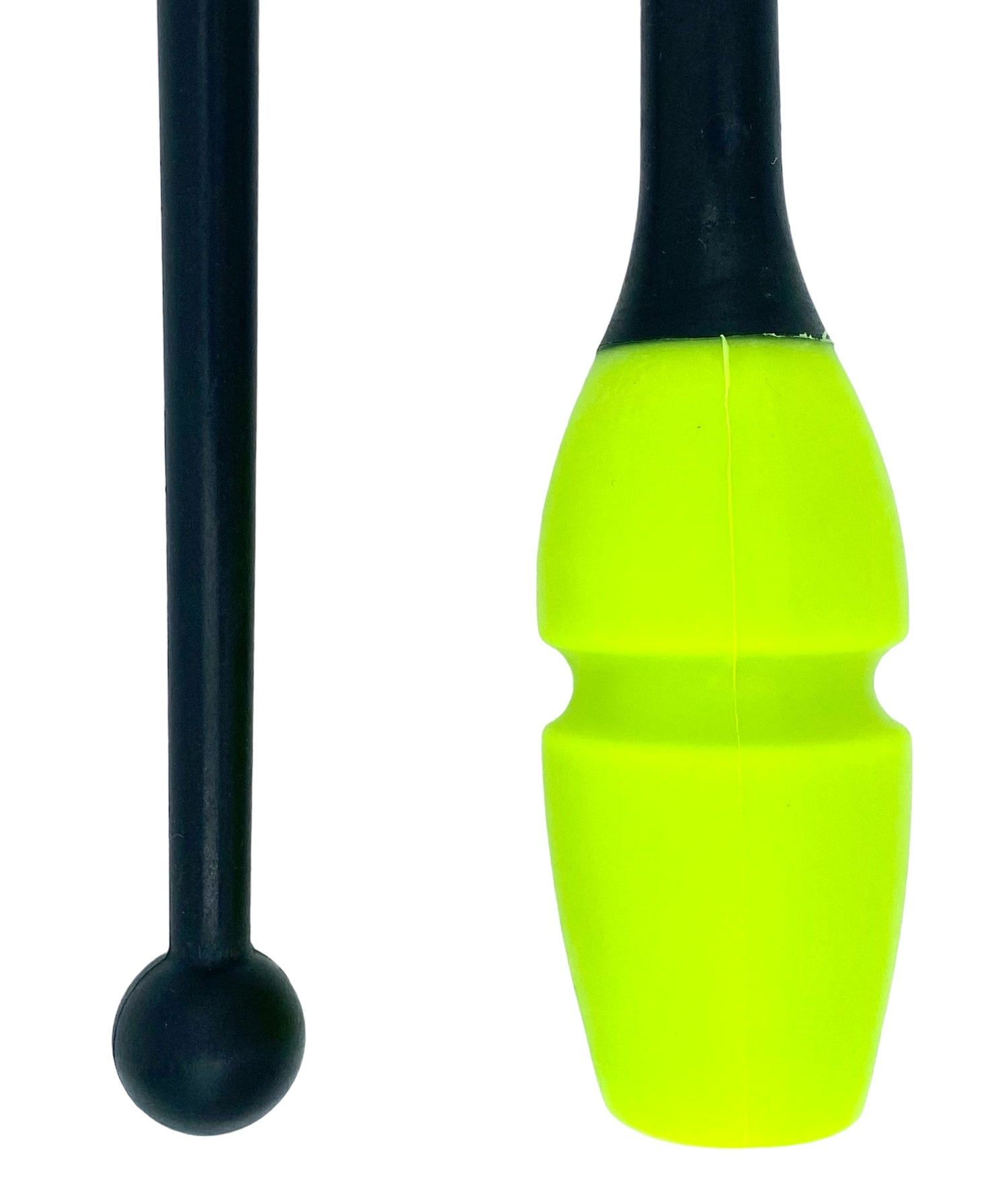 Tofarvet gymnastikkølle fra Pastorelli med en krop (den limegrønne del) af gummi, hvilket gør, at køllen kan stødes mod gulvet og springe tilbage.