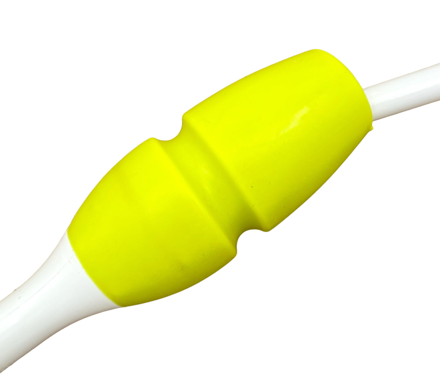 Tofarvet gymnastikkølle fra Pastorelli med en krop (den limegrønne del) af gummi, hvilket gør, at køllen kan stødes mod gulvet og springe tilbage.