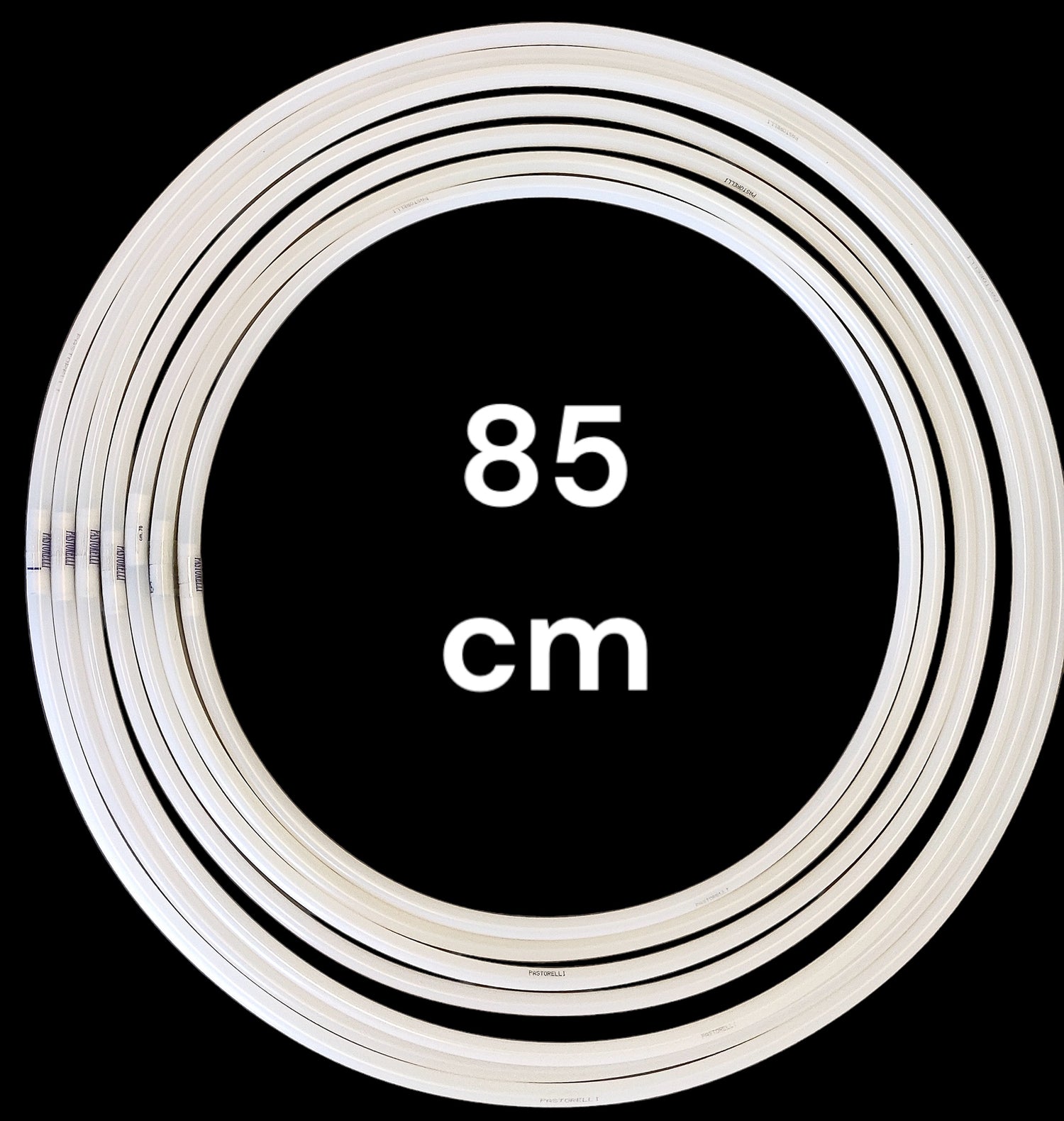 Tøndebåndet er 85 cm. i diameter (indvendigt mål) og den runde plastprofil er 14-15 mm i diameter.
