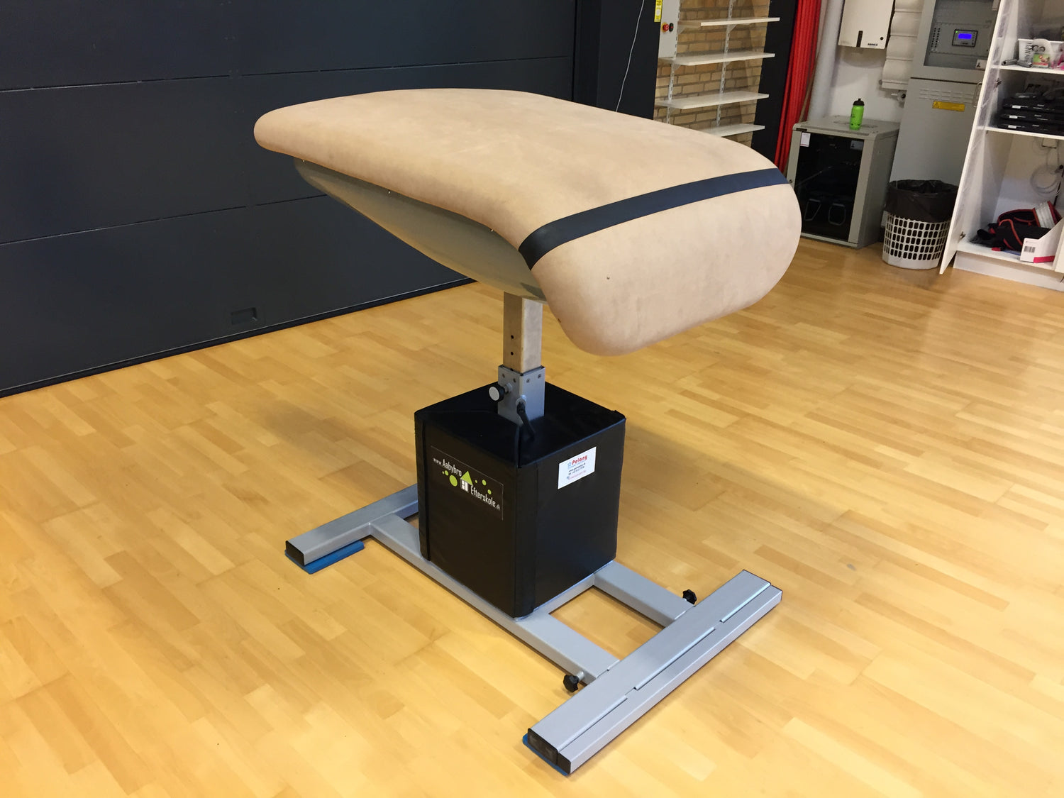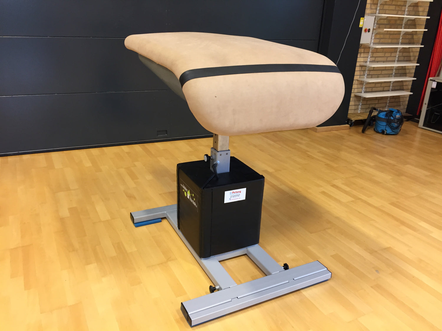 Monosøjle med gasfjeder til regulering af højde fra 125-165 cm.